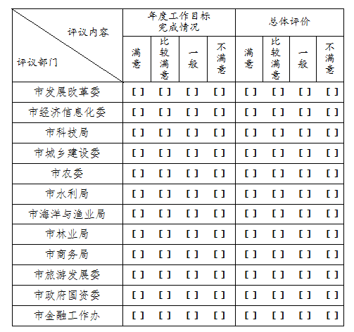 為調(diào)查了解市民代表對市政府部門履行職責(zé)的滿意度,請您結(jié)合市政府部門現(xiàn)場述職及平時了解掌握的情況,認(rèn)真填寫《2018年度市政府部門民主評議測評票》。測評結(jié)果納入2018年市政府部門綜合考核成績。