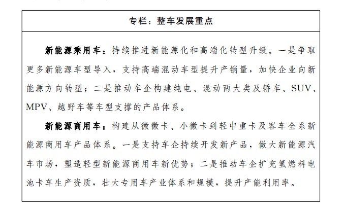 1.乘用車倍增發(fā)展。支持企業(yè)加快暢銷新能源車型的研發(fā)和上市,積極爭取整車企業(yè)在我市布局高端暢銷車型,提升中高端新能源車型產(chǎn)銷量,提高現(xiàn)有整車企業(yè)產(chǎn)能利用率。深化與相關(guān)企業(yè)集團(tuán)聯(lián)系機(jī)制,開展更深層次戰(zhàn)略合作,爭取新整車項目落地。(責(zé)任單位:市工業(yè)和信息化局、市發(fā)展改革委,有關(guān)區(qū)、市政府。以下各項工作均需有關(guān)區(qū)、市政府落實,不再一一列出)
