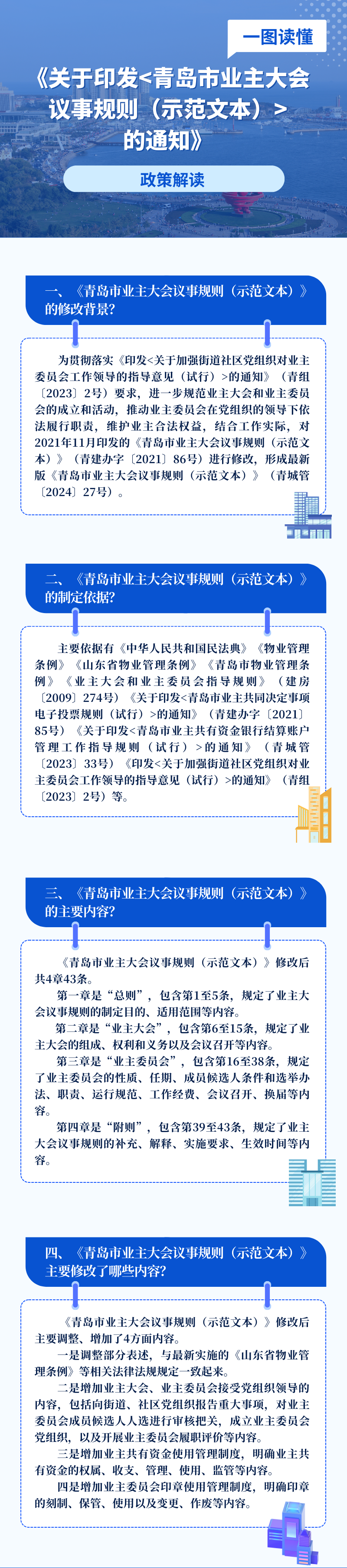答:為貫徹落實《印發(fā)<關于加強街道社區(qū)黨組織對業(yè)主委員會工作領導的指導意見(試行)>的通知》(青組〔2023〕2號)要求,進一步規(guī)范業(yè)主大會和業(yè)主委員會的成立和活動,推動業(yè)主委員會在黨組織的領導下依法履行職責,維護業(yè)主合法權益,結合工作實際,對2021年11月印發(fā)的《青島市業(yè)主大會議事規(guī)則(示范文本)》(青建辦字〔2021〕86號)進行修改,形成最新版《青島市業(yè)主大會議事規(guī)則(示范文本)》(青城管〔2024〕27號)。