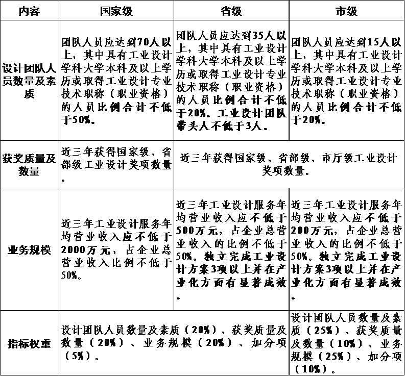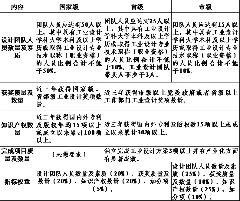 《辦法》附件包括市級工業(yè)設(shè)計中心主要評價指標(biāo)、市級工業(yè)設(shè)計中心申請表、青島市工業(yè)設(shè)計中心年度情況統(tǒng)計表。其中,市級工業(yè)設(shè)計中心主要評價指標(biāo)分為企業(yè)工業(yè)設(shè)計中心評價指標(biāo)和工業(yè)設(shè)計企業(yè)評價指標(biāo),明確了申報市級工業(yè)設(shè)計中心需滿足的基本要求和各項評價指標(biāo)所占權(quán)重,并對評價指標(biāo)中各名稱做出了解釋說明;市級工業(yè)設(shè)計中心申請表和青島市工業(yè)設(shè)計中心年度情況統(tǒng)計表分別對市級工業(yè)設(shè)計中心的申請和我市工業(yè)設(shè)計中心的日常管理做出了規(guī)范。