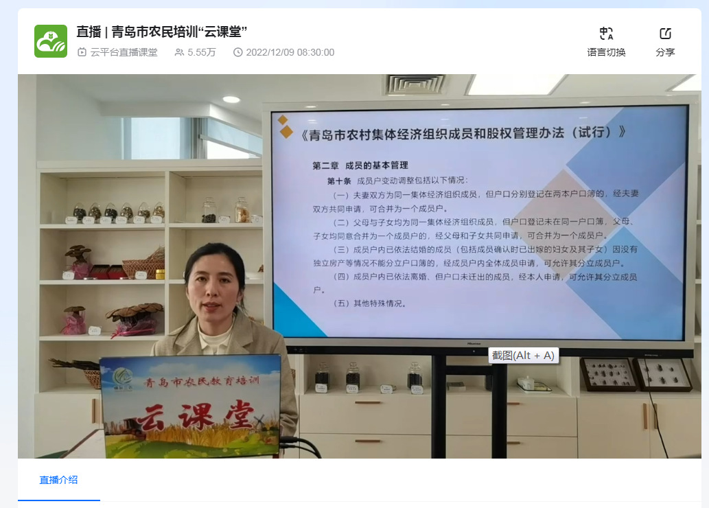 12月9日,市農(nóng)業(yè)農(nóng)村局宋揚(yáng)副處長、博士,通過青島市農(nóng)民培訓(xùn)”云課堂“,線上解讀《青島市農(nóng)村集體經(jīng)濟(jì)組織成員和股權(quán)管理辦法(試行)》