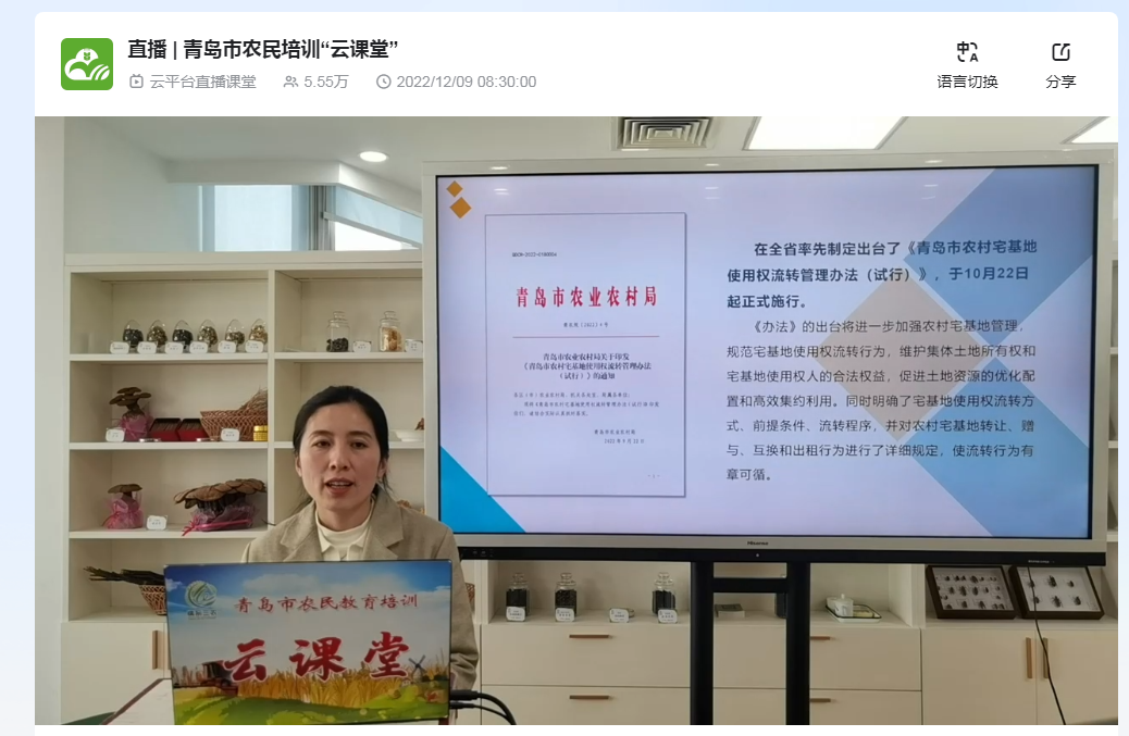 12月9日,市農(nóng)業(yè)農(nóng)村局宋揚(yáng)副處長(zhǎng)、博士,通過(guò)青島市農(nóng)民培訓(xùn)”云課堂“,線上解讀《青島市農(nóng)村宅基地使用權(quán)流轉(zhuǎn)管理辦法(試行)》